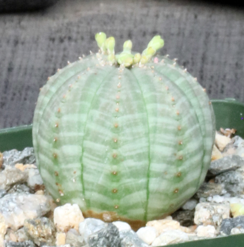This species is readily available in cultivation but almost extinct in the wild, where it occurs only at a few localities near Graaff-Reinet in the Eastern Cape Province of South Africa. Fortunately, it is easy to propagate and therefore will always exist as long as there are succulent plant collections. Our small Euphorbia obesa have spherical stems with horizontal purplish-brown coloring. Our medium-sized plants are spherical with a short cylindrical main stem. The stems range in color from grey to colored with horizontal purplish-brown stripes. These seedlings stand 1-2 inches tall and fit in 4-inch pots.