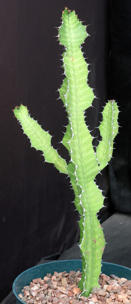 This tree Euphorbia is interesting because of the wavy, bright green branches that are 2- to 3-angled. This variegate form has yellow veins that stand out strikingly against the green background. The cyathia are yellow. These plants are rooted cuttings in 8-inch pots.