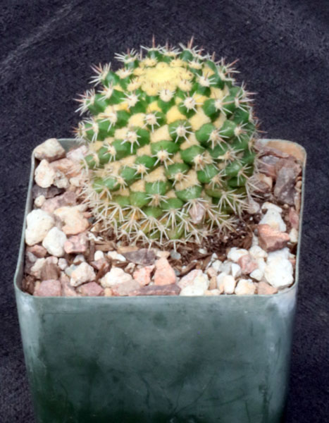 This species, from Honduras and southern Mexico, has a green globose body with rather short yellow spines on tubercles. The flowers are yellow with red highlights. These plants are seedlings in 4-inch pots.