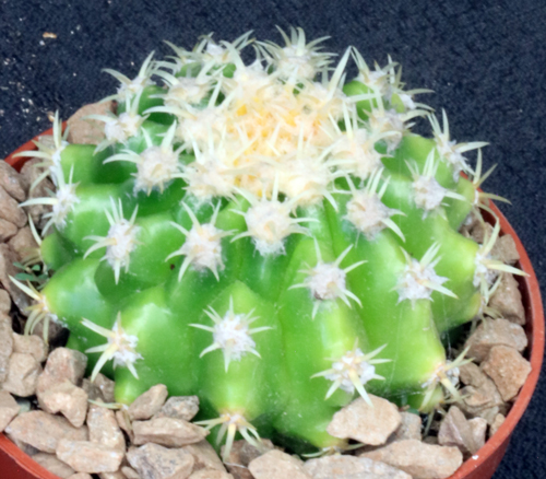 Golden Barrels are from a restricted area in Queretaro, Mexico, where they are nearly extinct in the wild. Variety brevispinus has short spines on elongated tubercles raising above a yellow-green body. The flowers are insignificant. These plants are seedlings in 5-inch pots.