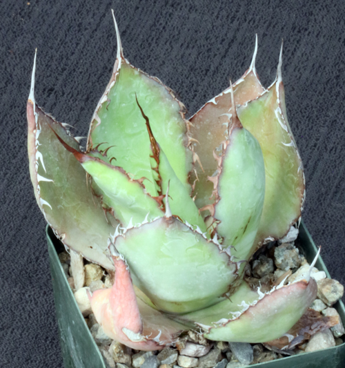 This beautiful Agave is from the northwestern Mexican states of Sonora, Chihuahua, and Sinaloa. The name refers to cow horns, which describes the opposite pattern of the fierce horn pattern on the leaf margins. This large rosette species does not offset. The leaves are a lovely yellow-green with some red highlights, and they are glossy with prominent leaf imprints. This species is frost sensitive, although in our experience we get marginal leaf damage at 23F. These plants are seedlings in 4-inch pots.