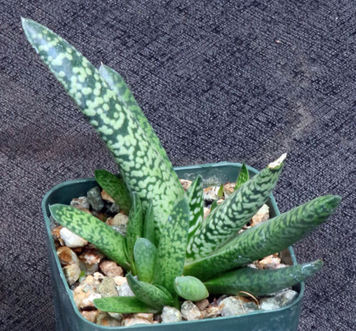 This hybrid, attributed to Etwin Aslander of South Africa, produced a plant with a distinctive glossy leaves with white markings. These plants are rooted offsets in 3-inch pots.