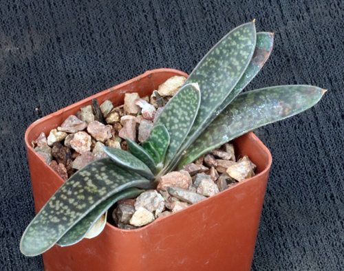 This new species, closely related to G. brachyphylla, is from Swartwaterpoort in the Northern Province of South Africa. It differs from G. brachyphylla because of the more rounded leaves, with their soft pink-red pastels, and the fact that the distichous leaves tend to lay flat instead of being erect. These plants are seedlings in 3-inch pots.