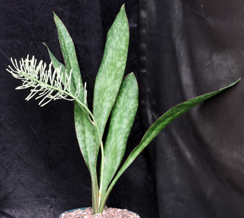 From Zaire, this broad-leaf species generally has spreading, dark brown-green leaves. Unlike typical plants of this species, these plants have considerable patterning. These plants are rooted offsets in 8-inch pots.