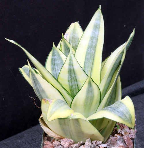 S. trifasciata var. hahnii has the shortest leaves in the S. trifasciata complex. This cultivar has nearly yellow-gold leaves with subtle green banding. This form also is more prostrate than the typical var. hahnii. These plants are rooted offsets in 4-inch pots.
