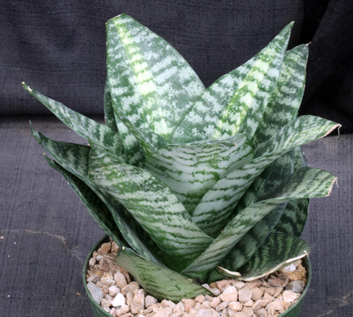 S. trifasciata var. hahnii has the shortest leaves in the S. trifasciata complex. This cultivar has green leaves with central yellow-white mottling on the leaves. This form also is more upright than the typical var. hahnii. These plants are rooted offsets in 6-inch pots.