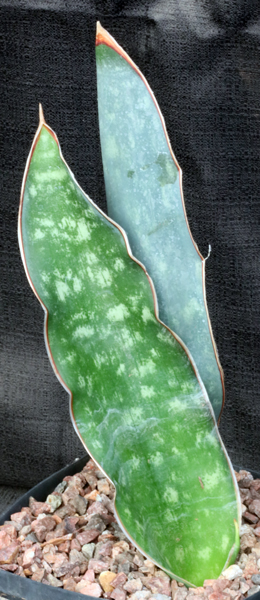 From Tanzania, Malawi, and Mozambique, this broad-leaf species has long, down curving leaves mottled with green and white and bearing limited pink-red tones. This form, dubbed Superclone (GC 81-071) for its large size, is from Tanzania. The leaves have a wavy margin, a rough feel on the backside, and a flexible apical tip; Superclone tends to have more of a glaucous look to the upper leaf surface. These plants are rooted offsets in one-gallon pots.