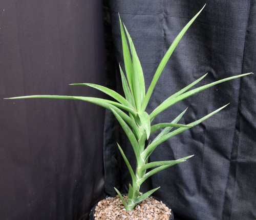 This species is from the coastal areas of central Tanzania, particularly near the town of Bagamoyo (WY 1117). This slender arborescent species naturally grows in dense shade. The leaves are long and quite flexible, and the plants tend to have a maximum height of about 3-4 feet on each stem. These plants are rooted offsets in 2-gallon pots.
