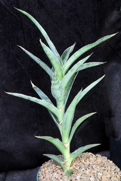 These plants are propagated from material originally collected near Tarasaa, Kenya (Bhitala 1021). Sansevieria arborescens is, as the epithet implies, one of the arborescent species of this genus. These plants have stiff, dark-green leaves that are darker and longer than S. ascendens var. bhwirei (Bhitala 1017) and stiff unlike S. dumetescens. These plants are rooted offsets in 8-inch pots.