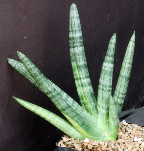 This cultivar, likely is a selection from within the large complex of Sansevieria suffruticosa, is a relatively small, slow-growing plant. Its leaves are highly decorated with mottling and, unlike S. suffruticosa, they are only slightly rough. These plants are rooted offsets in one-gallon pots.