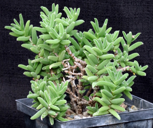 This low-growing shrubby species is from the Eastern Cape Province of South Africa. The typically roundish green leaves have a distinctive yellow-orange diadem of bristles at the tip. The flowers are light purple in color. These plants are seedlings in 5-inch pots.