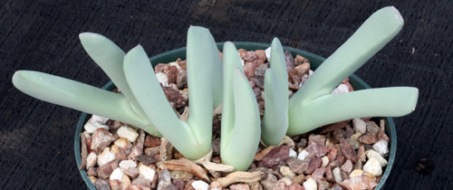 From Namaqualand in South Africa, this little squat mesemb was once known as Cheiridopsis candissima. It has blue-green paired leaves that are long and resemble scissors. The flowers are yellow. These plants are seedlings in 6-inch pots.