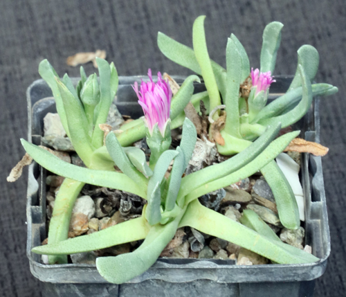 This species is rather widely distributed in the Great Karoo of South Africa, although locally restricted to certain types of soils in grassland vegetation. The leaves are roughly triangular, thin, long, and green. The flowers are multicolored, white at the base with purple-pink petal tips. These plants are seedlings in 4-inch pots.