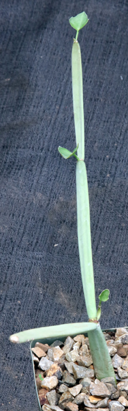 Widespread on the island of Socotra (Yemen), this species is a low shrub that grows mostly in the lower elevation alluvial fans or on mostly limestone slopes. Unlike many members of the genus Cissus, this one does not have climbing stems. The stems are flattened and gray-green in color, the leaves are small and inconspicuous, and the flowers are also inconsequential. These plants are rooted cuttings in 4-inch pots.