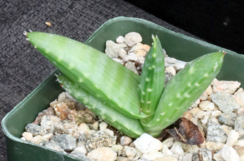 This sure looks like seedling Aloe pearsonii but the propagator is strident that it is A. pearsonii x Gasteria glomerata. Who knows what this is going to turn into. These plants are seedlings in 4-inch pots.