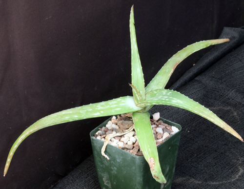 This cremnophilous species is from one locality in Angola. This offsetting species has short, pendulous stems producing a rosette of yellow-green white-spotted leaves. The flowers are orange-red. These plants are rooted offsets in 4-inch pots.