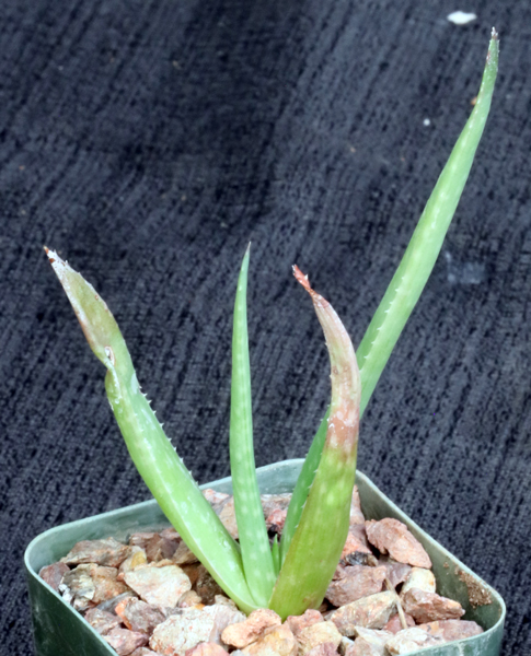 This species, from Cameroon and Zaire (Congo), has plants that occasionally offset but mostly have medium-sized, solitary rosettes. The leaves are blue-green with abundant faint-white spots and a pinkish-white margin with reddish-white marginal spines. The flowers are bright red. These plants are rooted offsets in 2-inch pots.
