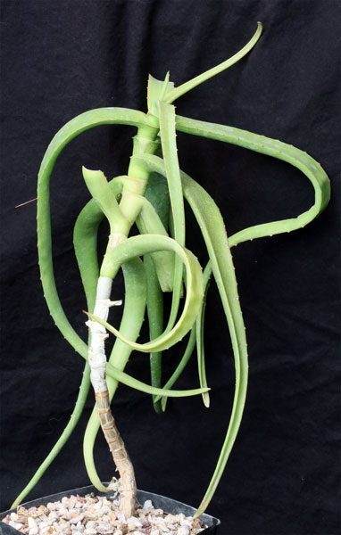 From the mountains of northwest Yemen, this species is a cliff hanging plant with green, spotted leaves and panicles of red flowers that are produced in the fall. We’ve grown this species outside in Tucson for many years, and it takes significant frost. This species took significant damage at 23F but was not killed at 18F. These plants are seedlings in one-gallon pots.