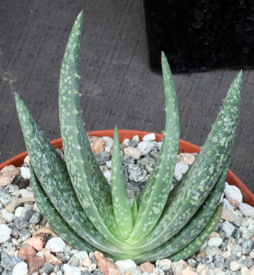 From the mountains of southern Saudi Arabia into northwestern Yemen, this acaulescent Aloe has affinities to several other species in the region, particularly Aloe tomentosa. The leaves are gray-green and spotted when young. The flowers are light yellow red and striped with green. These plants are seedlings cuttings in one-gallon pots.
