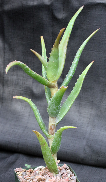 This species is from east-central Africa, centered on Malawi and extending northwards and southwards. This shrubby species produces few branches, each of which bear a terminal rosette of gray-green leaves with a bluish cast and faint lines. The flowers are red. We have some difficulty growing these plants in Tucson owing to the high summer heat, and we wouldnt even consider growing this species outdoors in the winter. These plants are rooted offsets in 5-inch pots.