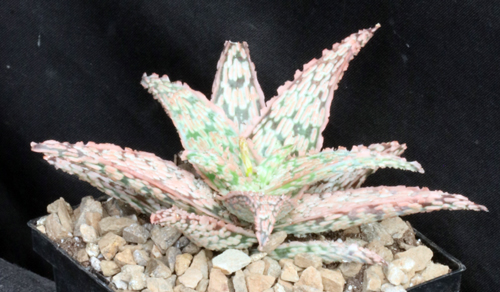 This likely is a Kelly Griffin hybrids with a completely unknown heritage. The raised bumps on the leaves, combined with the reddish cast and a pinkish margin, create an attractive miniature plant. These plants are rooted offsets in 5-inch pots.