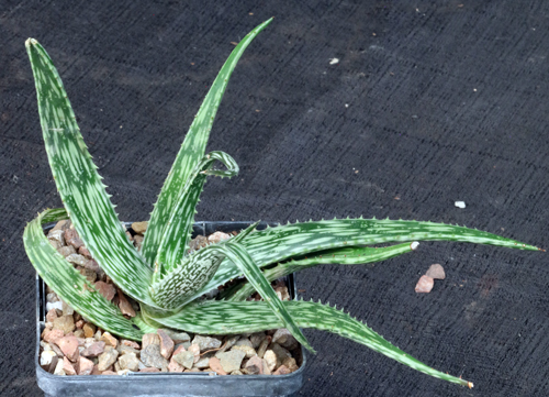 This species, clearly from Somalia, forms a small rosette and gradually offsets. When kept in shade, the leaves are almost black-green with light elongated spots and red teeth on the margins. In variety marmorata, the coloration is lighter and somewhat resembles the patterning of marble (as the epithet suggests). These rooted offsets are in 5-inch pots.