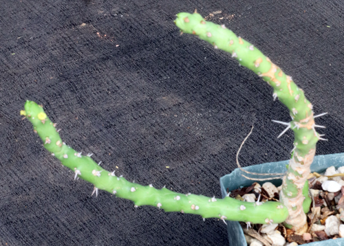 From the Sanaag Region of Somalia, this low-growing species has succulent round stems with small black spines. The cyathia are yellow. These plants are rooted cuttings in 4-inch pots.
