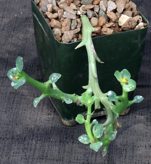 This shrub, from the Northern Cape Province of South Africa and southern Namibia, is highly variable in form and size. Flexible but thickened green branches have small to large tubercles. The cyathia are multicolored but reddish. In habitat, these plants are squat and very dense, but they become leggy when grown in greenhouses. These plants are seedlings in 4-inch pots.