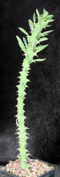 This Euphorbia hybrid has an unknown heritage and stumps us. It is interesting because of the green stems and white spine shields with extra heavy spination that actually isn’t as harmful as it looks. These plants are rooted cuttings in 4-inch pots.