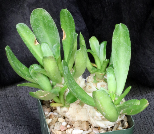 This species, from tropical West Africa, has thick cylindrical pale gray stems, up to 6-feet tall, bearing tuft of recurved spathulate leaves at the tips. This species is similar to E. unispina and E. venenifica. Rare and seldom offered, we have a seedling of this three-headed plant in 4-inch pots.