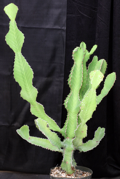 Euphorbia grandialata is from Mpumalanga Province of South Africa, where it grows in the eastern part on dolomitic hills. This large shrub has characteristically deeply constricted, 4-angled branches with prominent stripes and a spiny margin. These are rooted cuttings in 3-gallon pots.