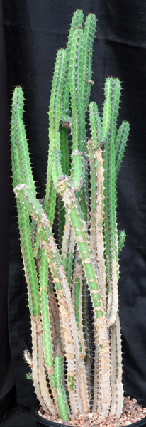 This shrubby Euphorb, from the Laikipia Plateau of central Kenya, is somewhat similar to Euphorbia tescorum from more northerly regions, only it has four-angled stems. This undescribed species branches from the base, producing long, wand-like stems that are rather stout and variegated with darker green blotches. The cyathia are yellow. They are rooted cuttings in 2-gallon pots.