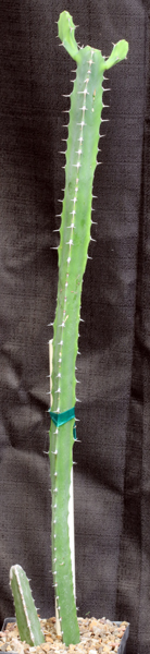 This species, from the southern Arabian Peninsula, forms a large shrub with triangular, spiny branches. It is sparsely branched, which makes for an interesting looking plants, and the spines are infrequent. The cyathia are yellow. Silly us, we once thought this species was rare, then we went to Yemen and found it all over the place. We offer rooted cuttings of this species in one-gallon pots.