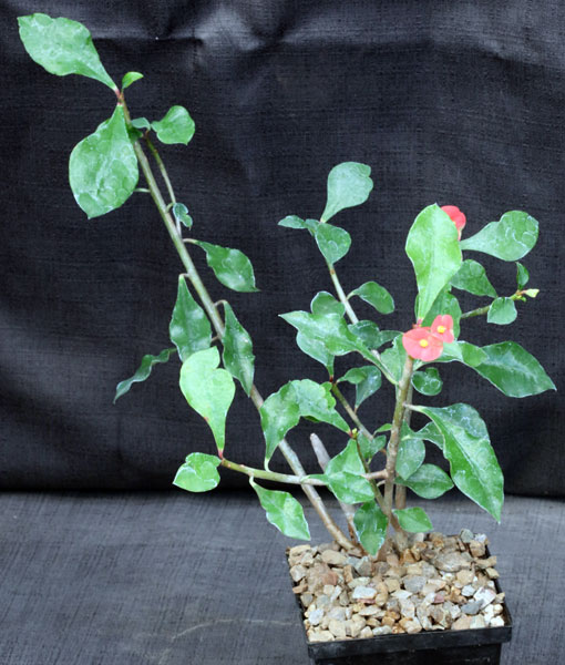 This species is a xerophytic one from northeastern Madagascar. It is a shrub with spiny branches bearing dark green shiny lanceolate leaves that tend to develop red margins. The cyathia are red. These plants are rooted cuttings in 5-inch pots.
