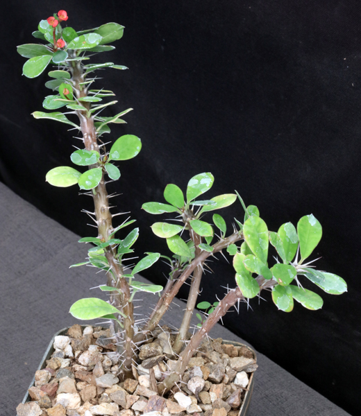 Imagine Euphorbia milii leaves and flowers atop a stem that looks like a thin gray ribbon protruding from the soil, and you have the best mental image of these plants. Each one is unique. These plants are rooted offsets in 5-inch pots.