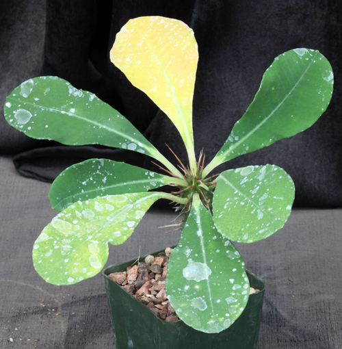 From northern Madagascar, Euphorbia viguieri is a highly variable group. E. viguieri var. viguieri is a single-stemmed species with ovate, bright green leaves and a stem with long, stiff, and dense stipules. Some plants have red markings at the base of the leaves, but this is not consistent among the plants. The flowers are a stunning red and held on a fairly short peduncle. These are seedlings in 4-inch pots.
