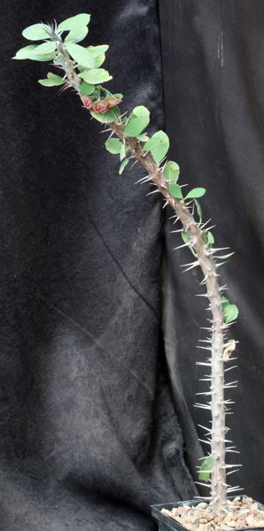 From Madagascar, this shrubby Euphorbia, related to E. milii, has spiny stems and brown, pubescent leaves. What makes this form special are the cyathia, which are red-green with purple highlights and an overall wild appearance. These plants are rooted cuttings in 5-inch pots.
