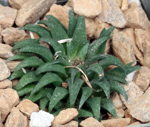 This is one of the tiniest Haworthias. Ours offset relatively rapidly, forming nice little clumps. Ours are from several sources, but all plants originally came from the type locality near Mossel Bay, South Africa (GM 284). These plants are rooted offsets in 3-inch pots.