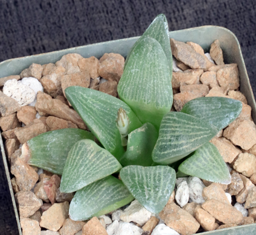 Our plants are GM 448 and are from the Humor area, East of Mossel Bay, South Africa. This is a very attractive variety that often has leaves that are densely silvery-white flecked with non-glossy chunky retuse leaves. This form at Cooper Station has greener and slightly glossy leaves. These plants are seedlings in 4-inch pots.