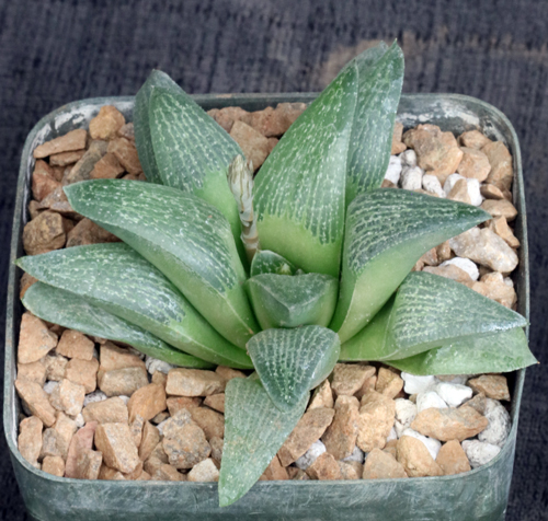 Our plants are GM 448 and are from the Humor area, East of Mossel Bay, South Africa. This is a very attractive variety that often has leaves that are densely silvery-white flecked with non-glossy chunky retuse leaves. This form at Cooper Station has greener and slightly glossy leaves. These plants are seedlings in 5-inch pots.