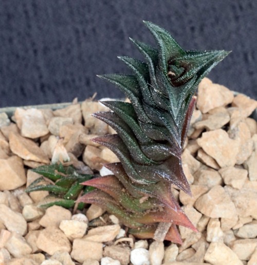 This black-leaved species, common through the Eastern Cape Province of South Africa, forms small rosettes. Our plants do not have collection data and have more open rosettes than the typical species, which are closely related to Astroloba aspera. These plants also have the nice nested leaves combined with that dark brown color that is unusual. These plants are rooted offsets in 4-inch pots.