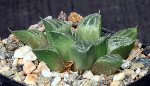 These plants are a cross between unknown Haworthias and(or) Haworthia hybrids. The cross was made by Kevin Hosmer. These plants are seedlings in 2-inch pots.