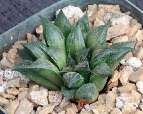 This offering is GM 305, and the original plants are from a locality 3 km south of Vermaaklikheid on northeast-facing slopes in calcrete. This one used to be Haworthia magnifica var. paradoxa, but Bayer (1999) changed that designation. These plants are rooted offsets in 5-inch pots.