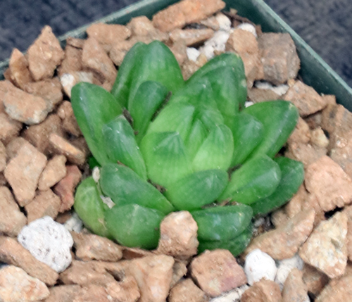 This species, unique in its stemmed plants, is from one locality on the south coast of the Eastern Cape Province of South Africa. It is a soft-bodied species has yellow-green leaves that are relatively chunky for this group. It offsets prolifically, filling pots and forming attractive clusters. These plants are rooted offsets in 4-inch pots.