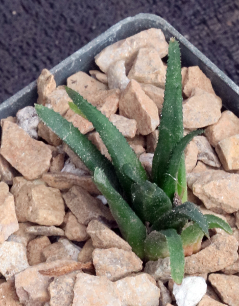 Our plants originally came from material collected in the Western Cape Province of South Africa (GL 6908). The variety is uncertain, but our plants are relatively large and green and they may well be Haworthia floribunda var. major. These plants are seedlings in 3-inch pots.