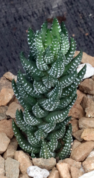 Haworthia coarctata var. bellula is found near the town of Adelaide in the Eastern Cape Province of South Africa. Bayer (1999) considers this to be a dwarf form of Haworthia coarctata var. adelaidensis, and he could be correct. This variety freely offsets, forming nice clumps with short and small stems. Our rooted offsets are in 4-inch pots.