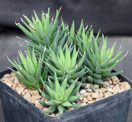 Haworthia coarctata is from the Eastern Cape Province of South Africa. Bayer (1999) considers the form known as riebeeckensis geographically separate form to be synonymous with Haworthia coarctata var. adelaidensis. Well keep it separate for now, following Bayers advice. These are relatively large, offsetting individuals. Our rooted offsets are in one-gallon pots.
