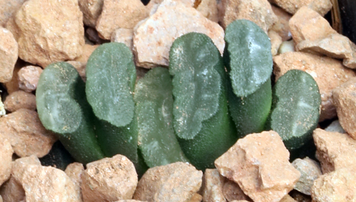 Haworthia truncata, from the Western Cape Province of South Africa, is a perennial favorite of plant collectors. The horse-teeth like arrangement of leaves, which tend to form close to the soil surface, are usually a solid dark color. Our plants are rooted offsets in 2-inch pots.