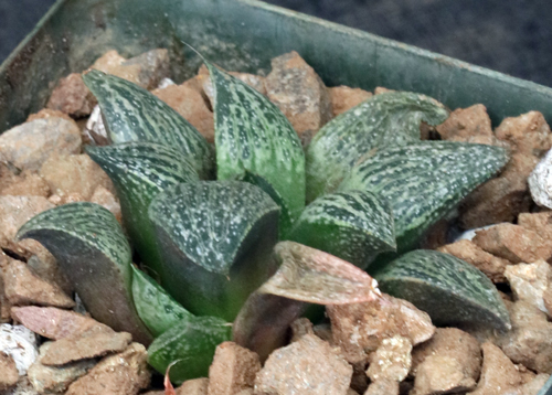 These plants (GM 320) are from the population east of Albertinia, Western Cape Province of South Africa, that Bayer (1999) includes in H. magnifica var. splendens. Differences between the species include more pointed leaves with greater spots in H. esterhuizenii as well as an earlier flowering period. These plants are rooted offsets in 4-inch pots.