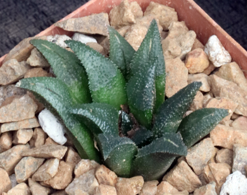 This Breuer species was originally collected as Haworthia magnifica var. aff. atrofusca from a location 6 km northwest of Riversdale (GM 412) in the Western Cape Province of South Africa. These plants have chunky leaves with faint windowing and few markings and an overall dark brown-green color. These plants are seedlings in 4-inch pots.